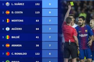 德转列前10联赛假摔染黄次数榜:苏牙&科斯塔9黄第一,C罗6黄上榜