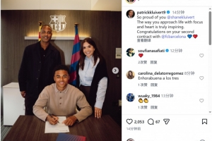 克鲁伊维特的儿子肖恩与巴萨B队续约至2028年,克鲁伊维特社媒晒出合照,配文:“为你感到无比骄傲,你以专注和热忱对待生活的态度,真的非常鼓舞人心。祝贺你与巴萨签下第二份合同。”