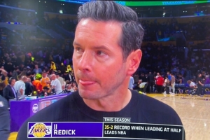 体育资讯4月13日讯 NBA常规赛,湖人半场62-45领先爵士。主帅雷迪克在中场时接受了采访。