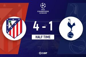 半场-马竞4-1热刺 金斯基连送大礼后被换下 格列兹曼小蜘蛛破门