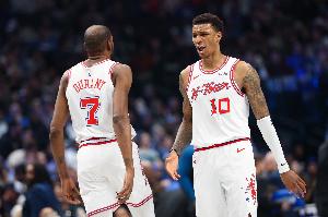 首节比赛,火箭进攻端靠杜兰特和小贾巴里·史密斯撑起来,二人内外线都很高效,其中杜兰特7中5(三分2中2)拿到12分1篮板1盖帽;小贾巴里·史密斯4中4(三分2中2)拿到10分1篮板1助攻。