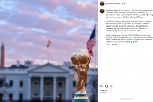 因凡蒂诺写道:“今晚,我与美国总统特朗普见面,讨论了即将举行的FIFA世界杯的筹备情况,并表达了我们对93天后世界杯即将开赛的激动心情。